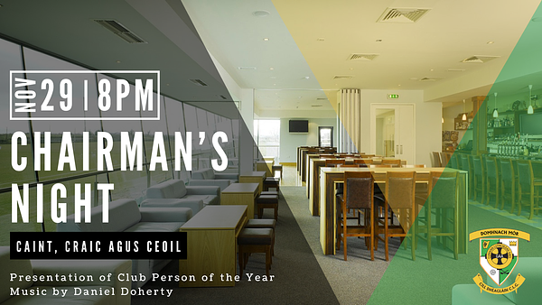 A chairde, our annual Chairman's Night takes place on Saturday 29th November in the club bar from 8pm. Finger food will be provided and the Craic agus Ceoil will run long in to the night as Daniel Doherty takes to the stage.